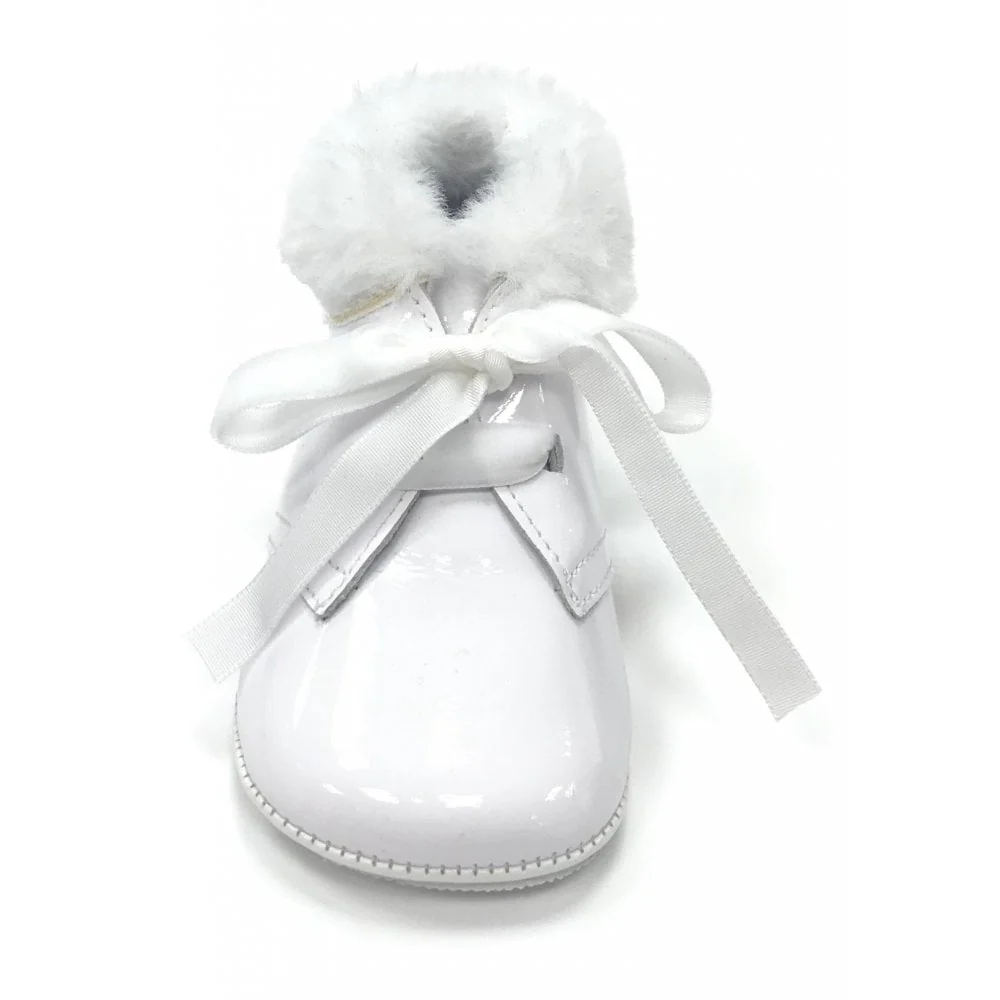 New from Andanines a baby pram bootie with a fur trim and luxurious velvet laces. These pram shoes have a lovely flexi sole bottom which is great for when there finding there feet.