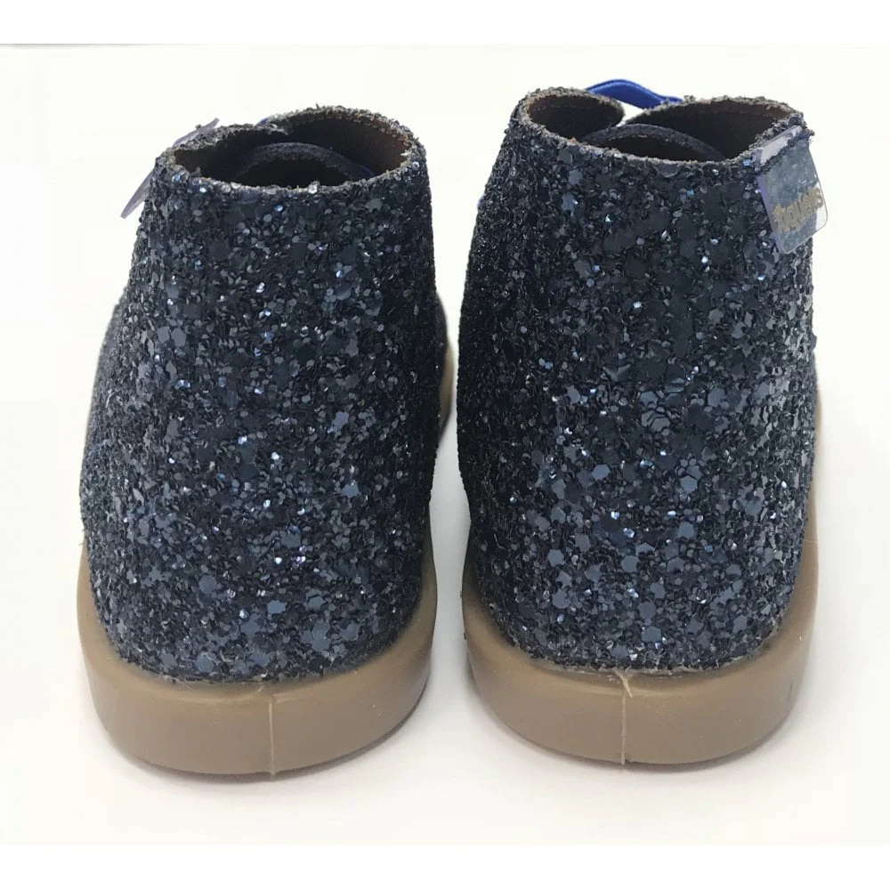 The perfect little desert boots set with a Suede front and a beautiful sparkly glitter back, finished with Suede ribbon laces and rubber soles.